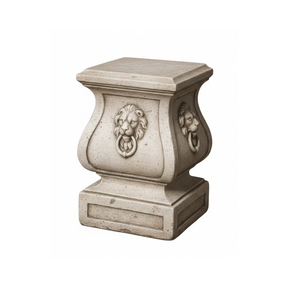 Socle décoratif en pierre reconstituée, orné de têtes de lions. Doté d'une finition claire et légèrement patinée, ce modèle offre un rendu authentique et texturé, sans excès. Idéal pour mettre en valeur vos statues, vases ou compositions florales avec sobriété. Un élément robuste et élégant qui s'intègre naturellement à tout aménagement extérieur ou intérieur.