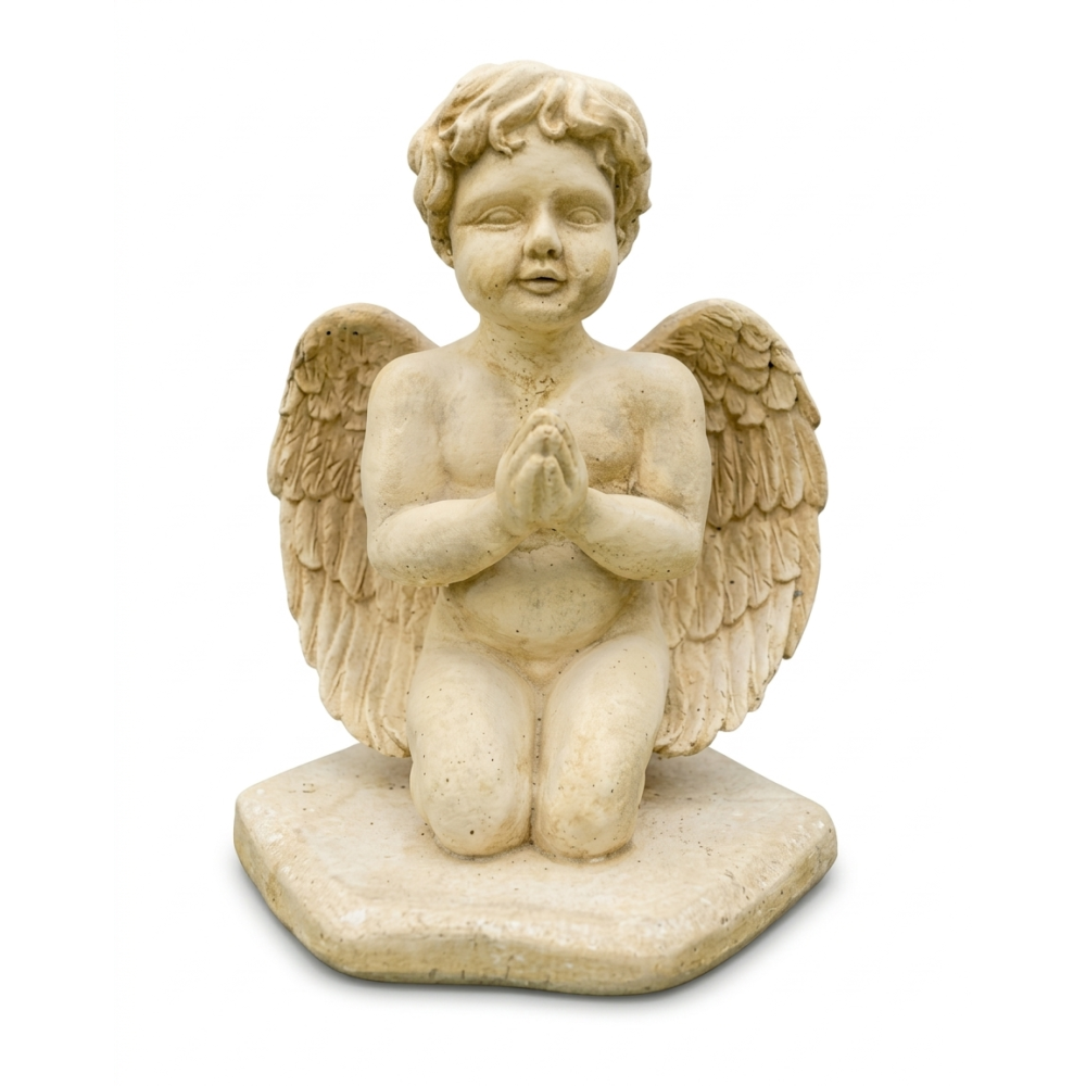 Cet ange en prière de 45 cm mise sur un aspect brut et authentique. Sa texture en pierre patinée, avec ses petites irrégularités naturelles, lui donne un vrai cachet sans en faire trop. Sa base hexagonale assure une bonne stabilité, que ce soit pour habiller un coin de jardin ou une terrasse. C’est un modèle robuste, conçu pour durer en extérieur tout en restant sobre. Un choix simple et solide pour apporter une présence apaisante à votre décor.