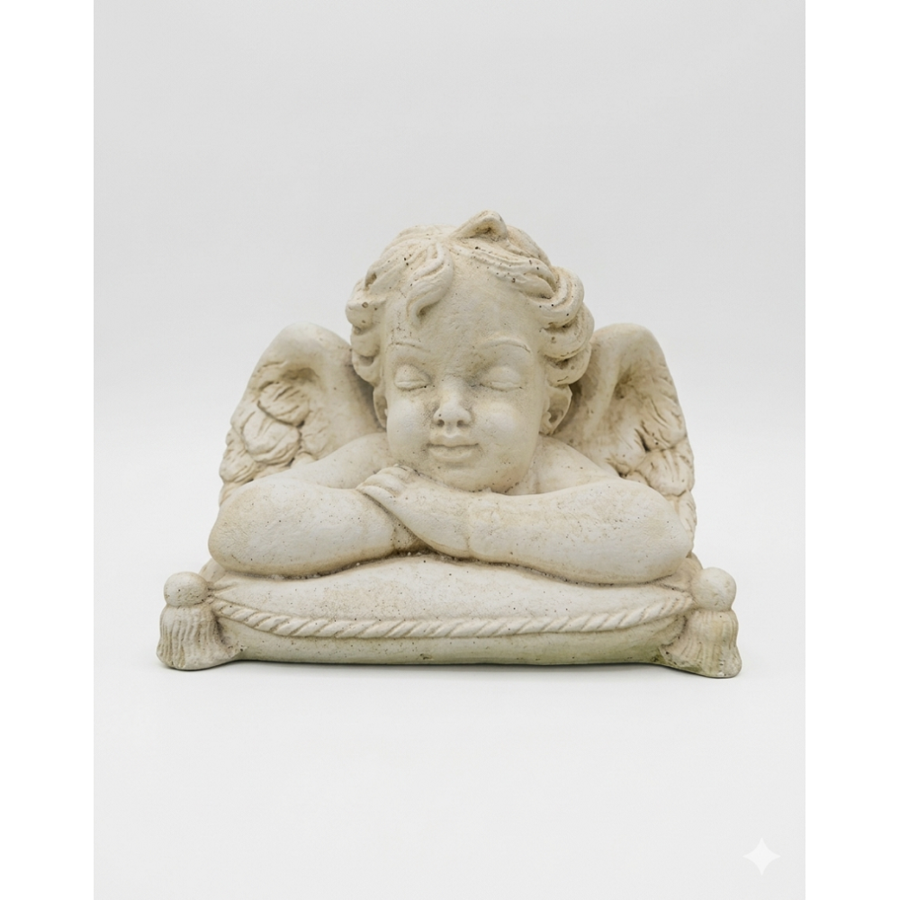 Apportez une touche de douceur et de paix à votre décoration avec cette délicate statuette d'ange endormi. Finement sculptée avec un effet pierre naturelle, elle repose avec tendresse sur un coussin orné de pompons élégants. Parfaite pour un jardin romantique, un intérieur classique ou comme objet de recueillement, cette pièce intemporelle captive par la finesse de ses traits et son expression apaisée.